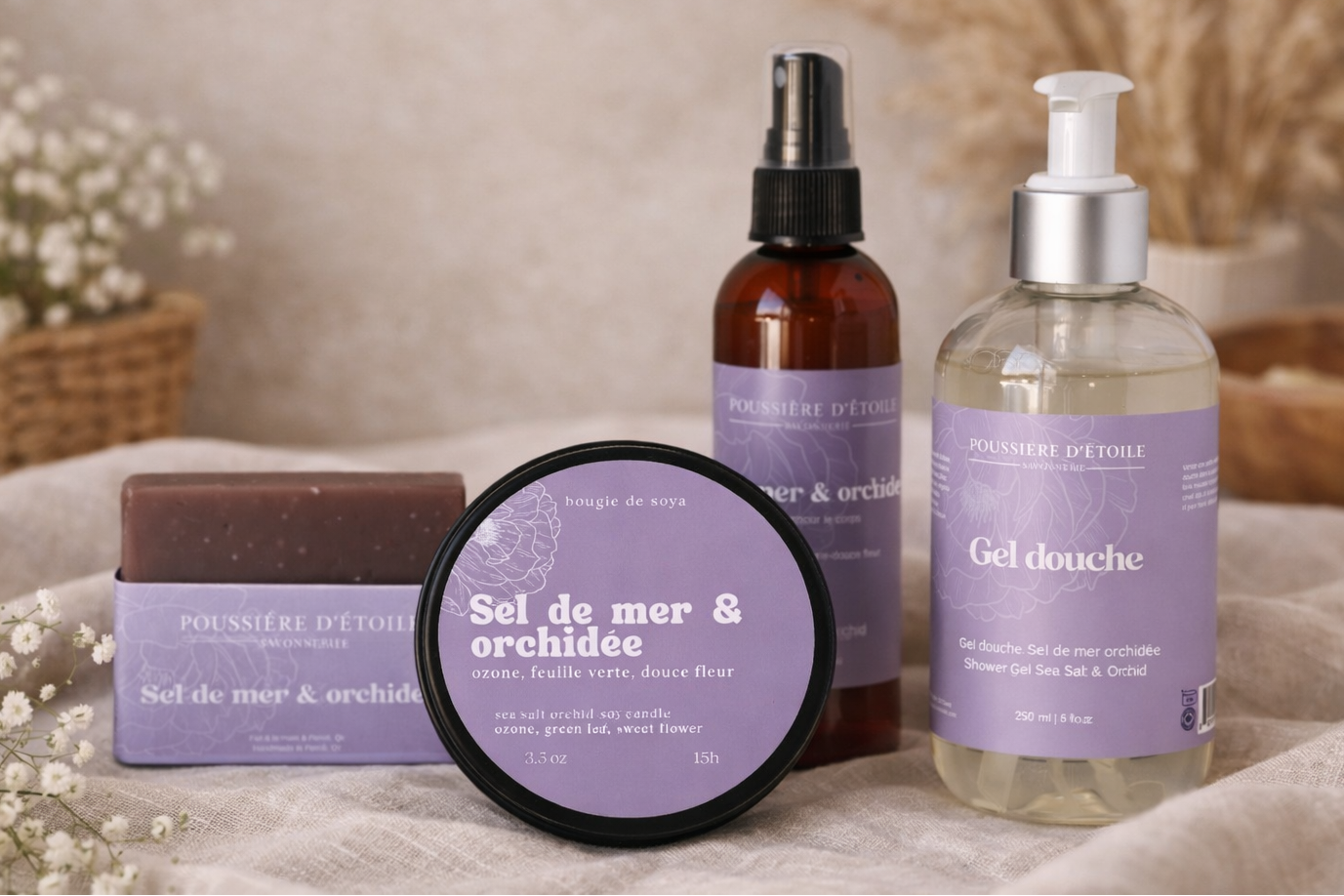 Chaque produit diffuse la même fragrance élégante où la fraîcheur du sel de mer rencontre la douceur florale de l’orchidée, créant une ambiance apaisante, propre et délicatement enveloppante.