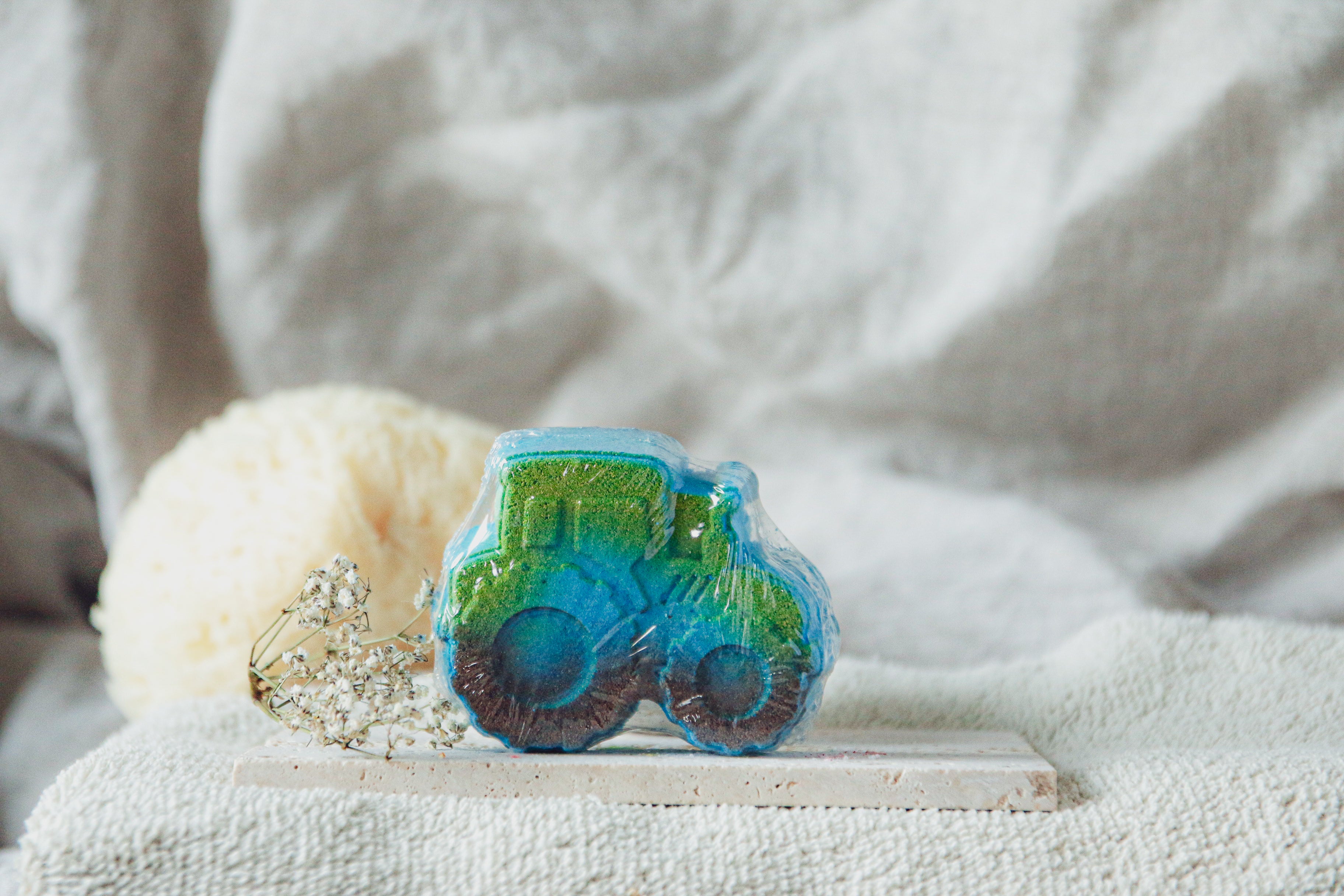 Transformez votre bain en une escapade champêtre et sensorielle avec notre Bombe de Bain Tracteur – L’Aventure Rurale et Fraîcheur de Bleuet !