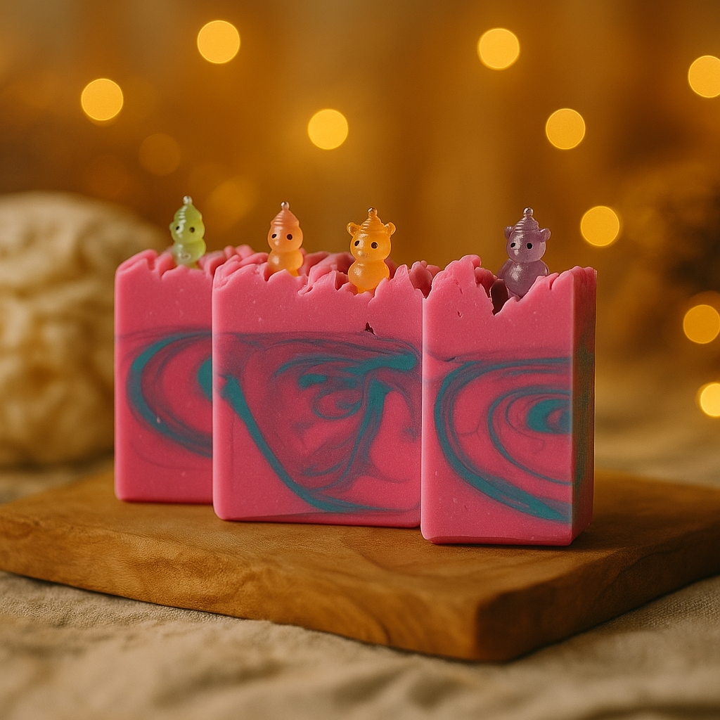 Experience a sweet, enchanting escape with this artisanal donkey milk soap scented like classic bubblegum. Its creamy lather gently cleanses the skin while releasing a playful, nostalgic aroma. Vibrant swirls and tiny unicorn toppers create a whimsical moment of joy in every wash. A limited-edition bar infused with pure, mystical charm.